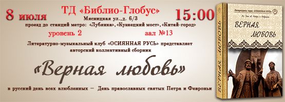 8 июля, в русский день всех влюбленных – День православных святых Петра и Февроньи – приглашаем вас на представление подарочного авторского коллективного сборника «Верная любовь».